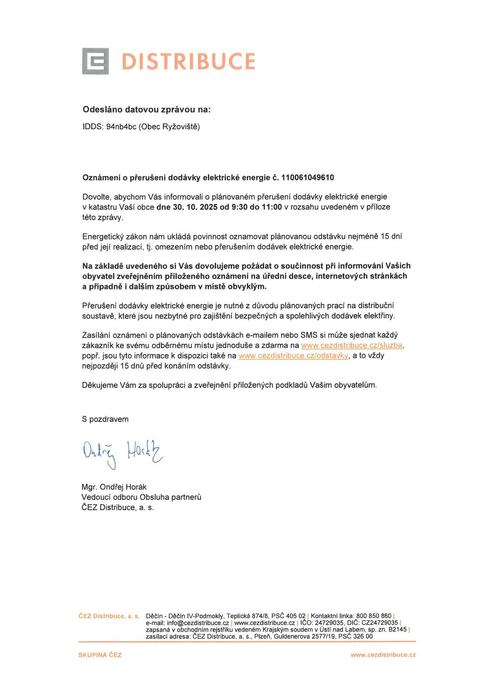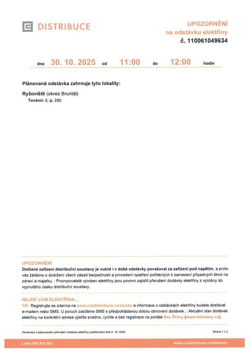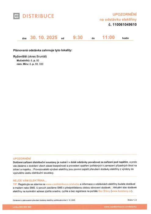 Dne 30.10.2025 od 9.30 - 11.00 hod dojde k přerušení dodávky elektrické energie  na ulicích: